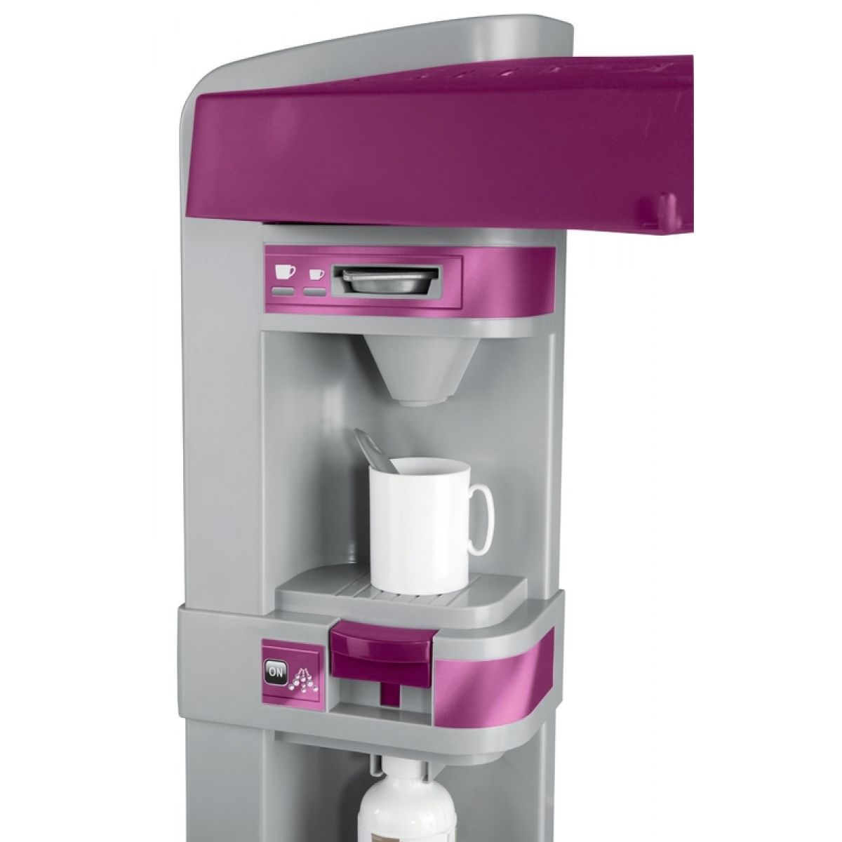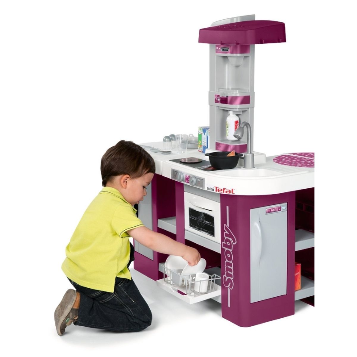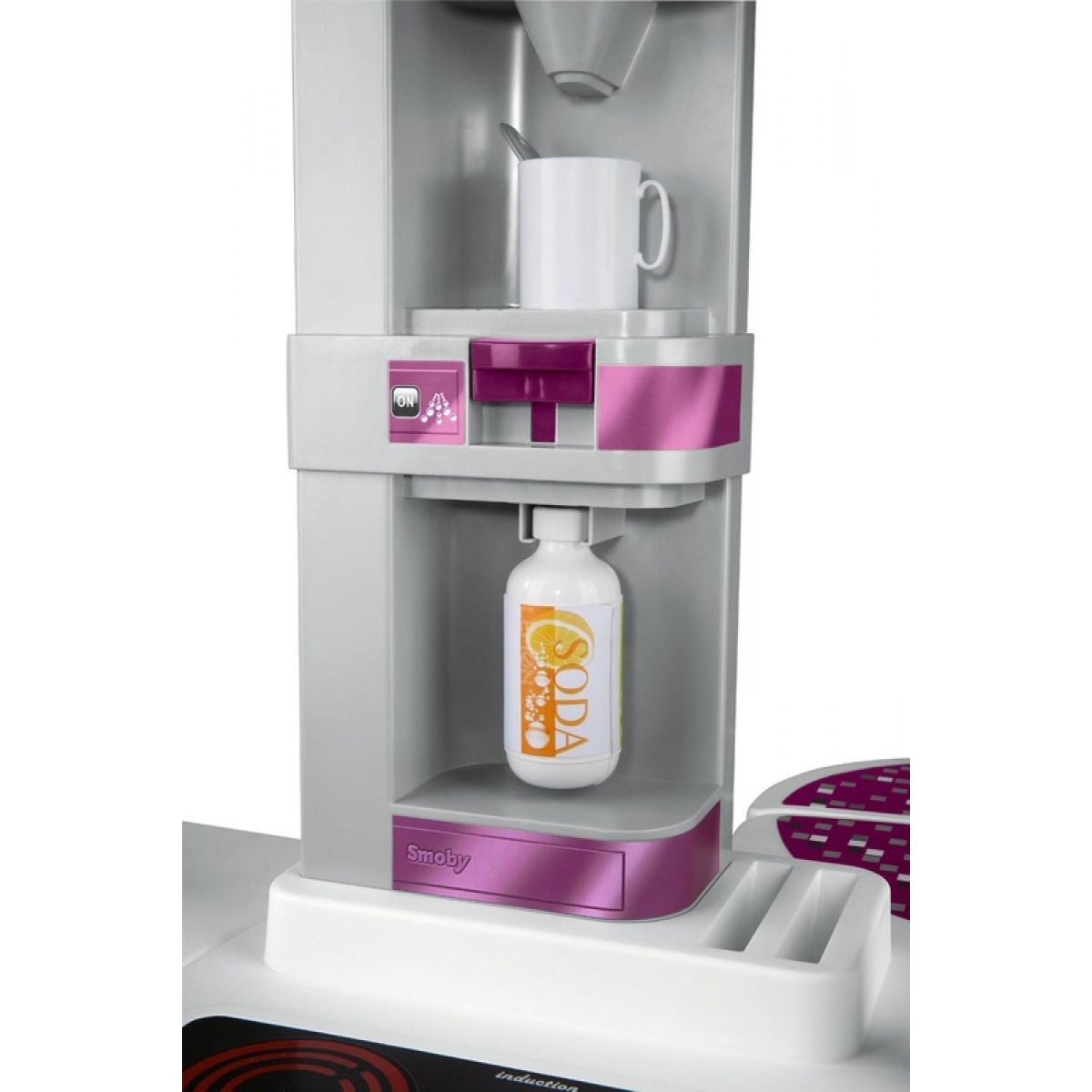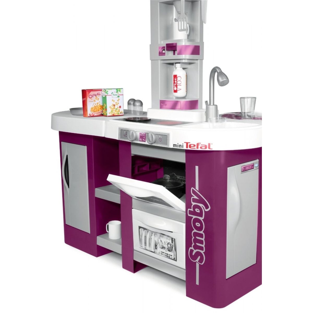 Velká plastová elektronická kuchyňka v moderních barvách obsahuje sporák se sklokeramickou deskou, digestoř, troubu, lednici, kávovar, výrobník na sodu, velkorysý úložný prostor a příslušenství v podobě nádobí, náčiní a atrap potravin. Kuchyňka vydává zvuky vaření.