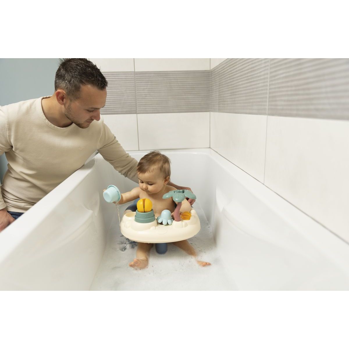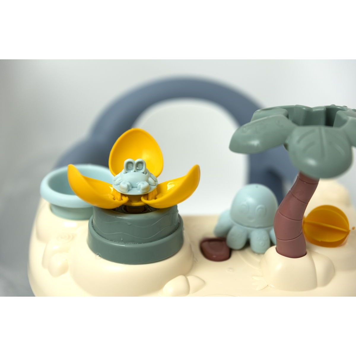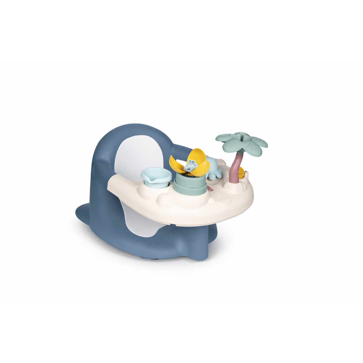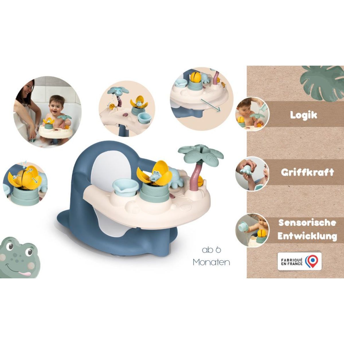 Mäkké sedadlo s oblými tvarmi bez ostrých hrán poskytuje pohodlie počas kúpania. Hrací pult so svojimi piatimi vodnými aktivitami – od vodného mlynčeka po striekajúcu chobotnicu – podporuje rozvoj detskej predstavivosti a motoriky. Štyri prísavky zabezpečia pevné uchytenie vo vani pre maximálnu istotu rodičov.