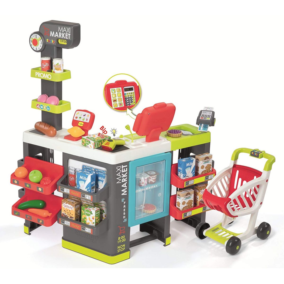 Veľký supermarket s el. pokladnicou so zásuvkou na peniaze, funkčnou kalkulačkou s LCD obrazovkou, mikrofónom, kreditnou kartou, snímačom čiarového kódu so zvukovým a svetelným efektom, váhou, chladničkou a nákupným vozíkom. K dispozícii je veľa ďalšieho príslušenstva: hodiny, makety potravín a zeleniny s ovocím, jogurty, plechovky, chlieb... Rozmery: 83 x 89,6 x 59,6 cm. Hmotnosť: 4,175 cm....