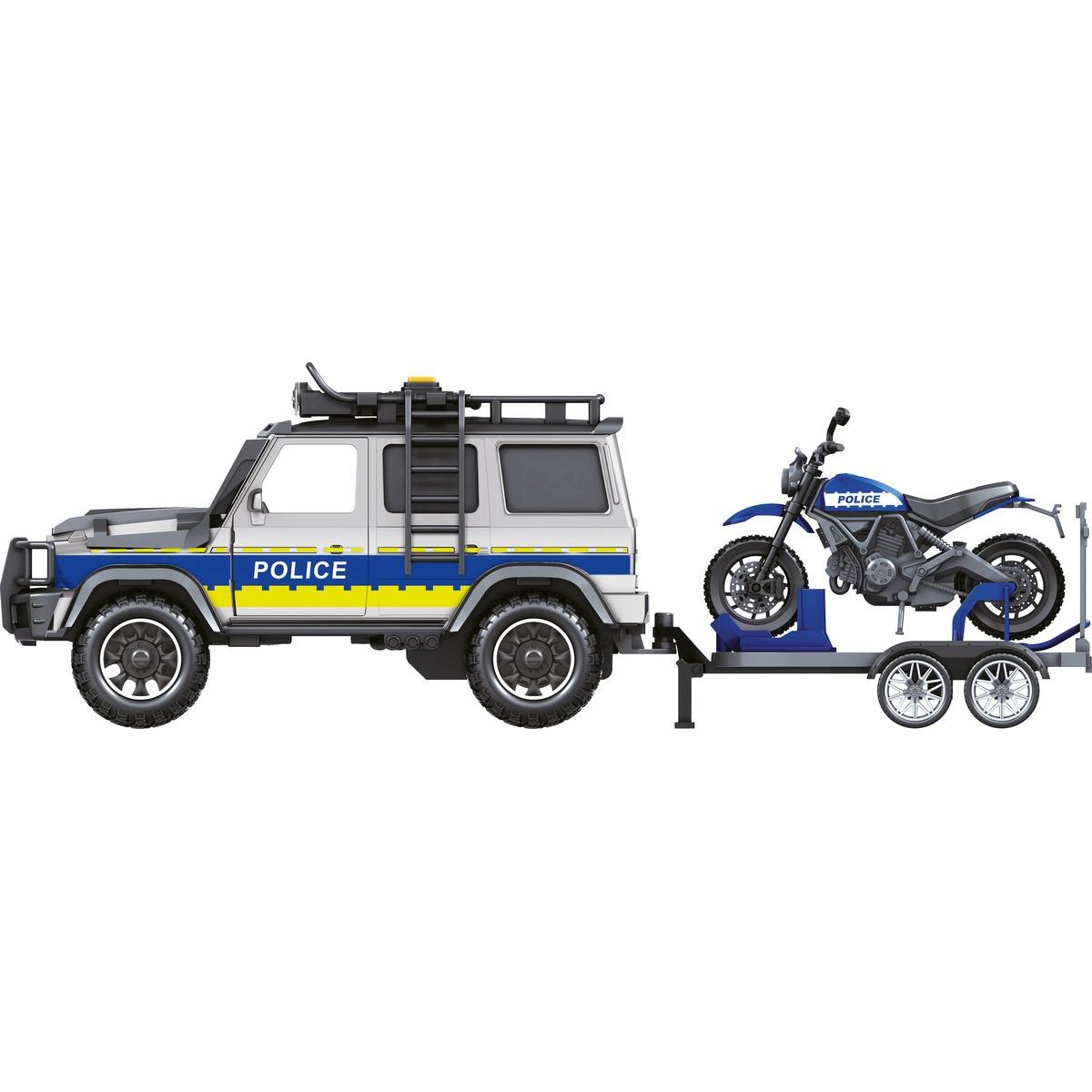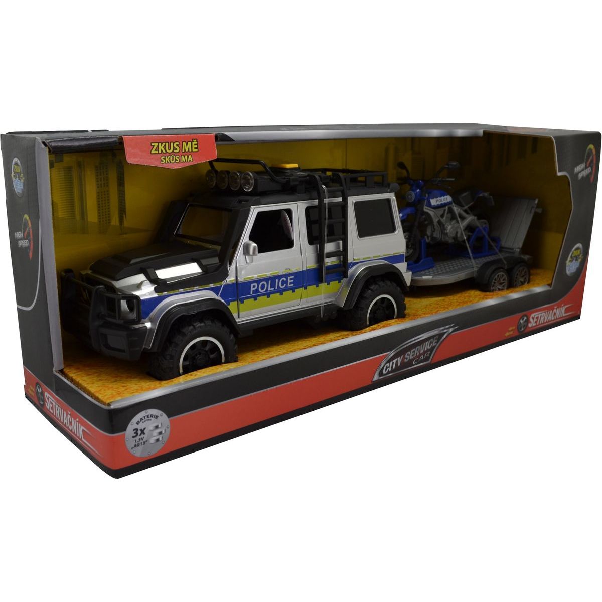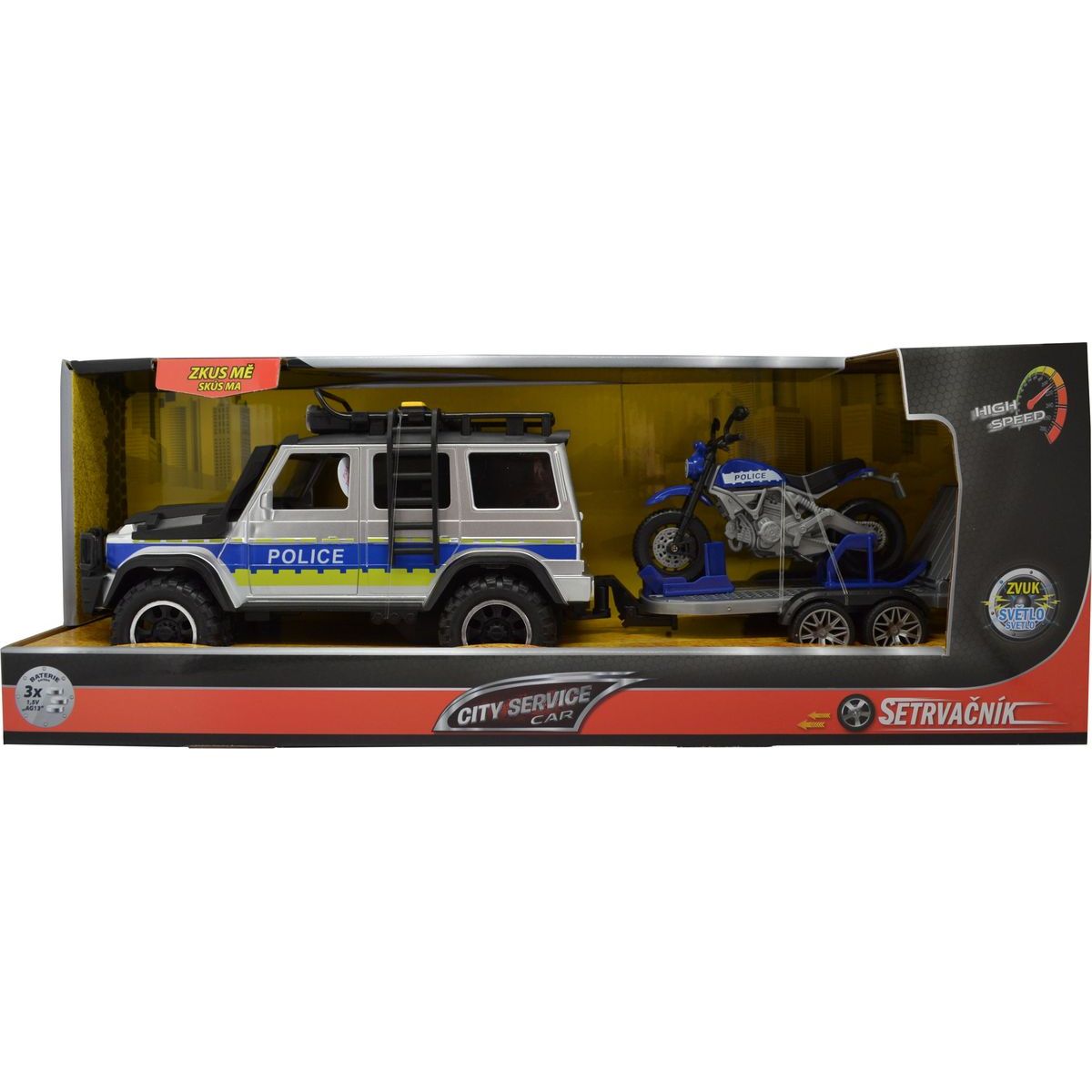 Policajné auto Sparkys CITY SERVICE CAR v mierke 1:14 so zvukom a svetlami prinesie veľa radosti deťom od 3 rokov. Príves s motorkou ponúka nové možnosti hrania sa na hrdinov, ktorí chránia mesto pred nebezpečenstvom. Batérie LR44 sú súčasťou balenia, takže zábava môže začať hneď po vybalení. Vďaka kompaktným rozmerom je hračka ľahko prenosná aj na výlety.