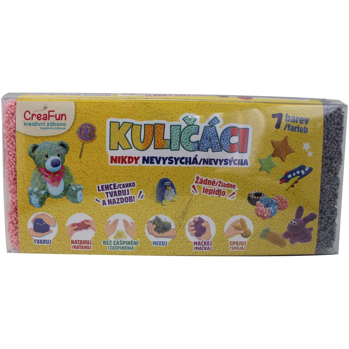 Objavte svet kreativity so zábavnou guľôčkovou hmotou Sparkys CreaFun v siedmich farebných variantoch! Táto hmota nevysychá, je netoxická a veľmi dobre tvarovateľná, čo umožňuje deťom miešať farby a vytvárať nekonečné množstvo originálnych dielok. Je vhodná pre deti od 3 rokov a zabezpečí im dlhé hodiny tvorivej hry. Balenie má rozmery 17 x 24 x 11 cm.