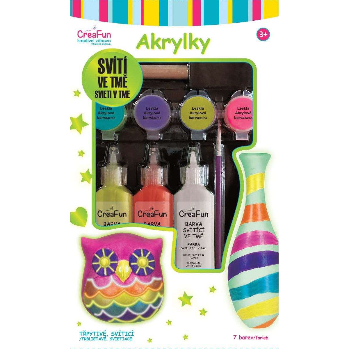 Sada Sparkys CreaFun prináša sedem farieb akrylových farieb, ktoré svietia v tme a dodajú vašim maľbám čarovný efekt žiariaceho svetla. Deti môžu tvoriť kreatívne maľby aj originálne dekorácie plné fantázie. Farby sú vhodné pre deti od troch rokov a ich ľahké balenie uľahčuje tvorbu doma aj na cestách. Zažite spolu zábavu pri vytváraní svietiacich obrázkov!