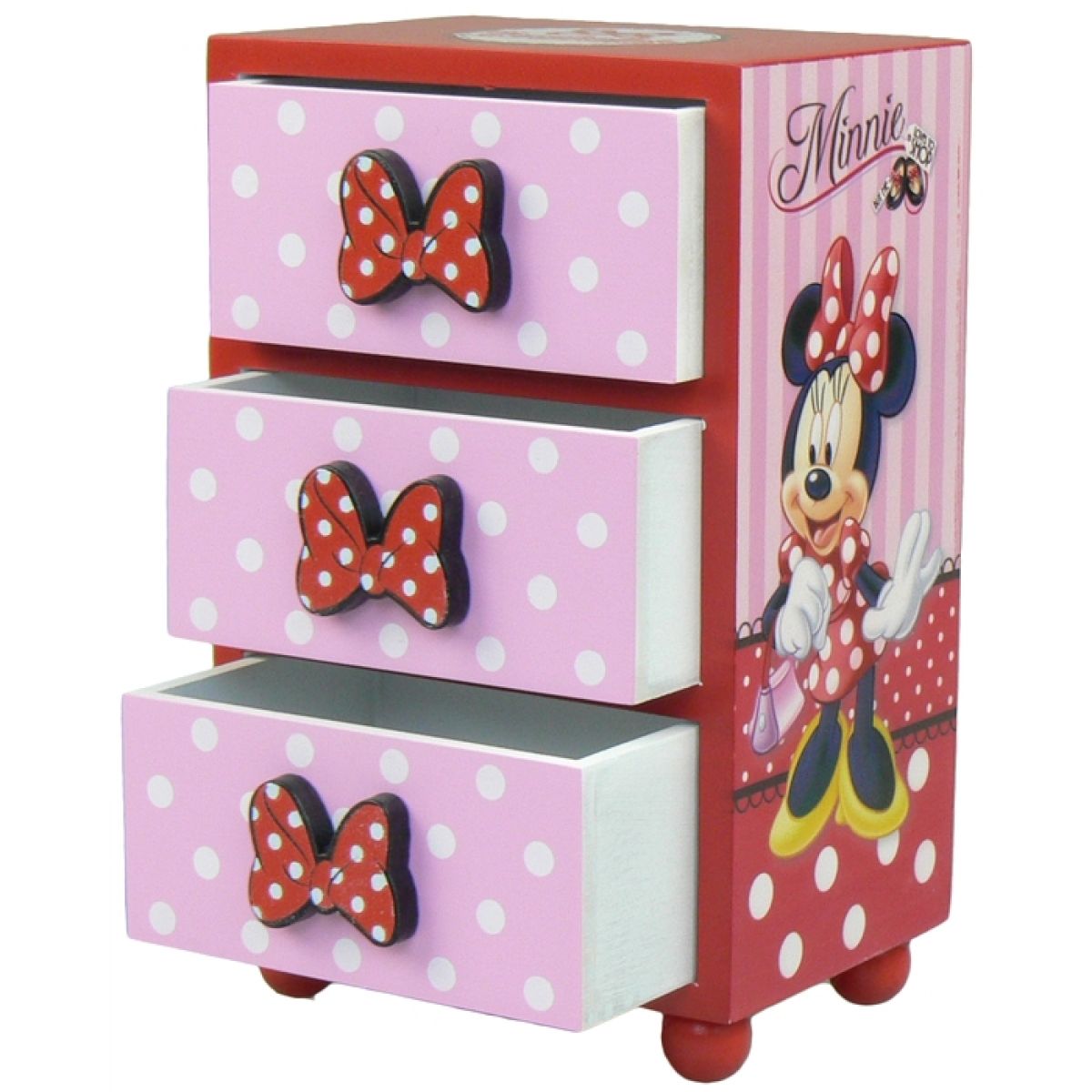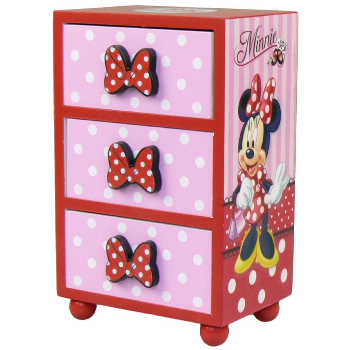 Růžová šperkovnice s oblíbeným motivem Minnie má v přední části tři šuplíčky. Je dřevěná a stojí na kulatých nožičkách. Úchyty na šuplíčkách jsou ve tvaru Minnie mašliček. Malé parádnice si budou mít kam ukládat svoje šperky a drobnůstky.