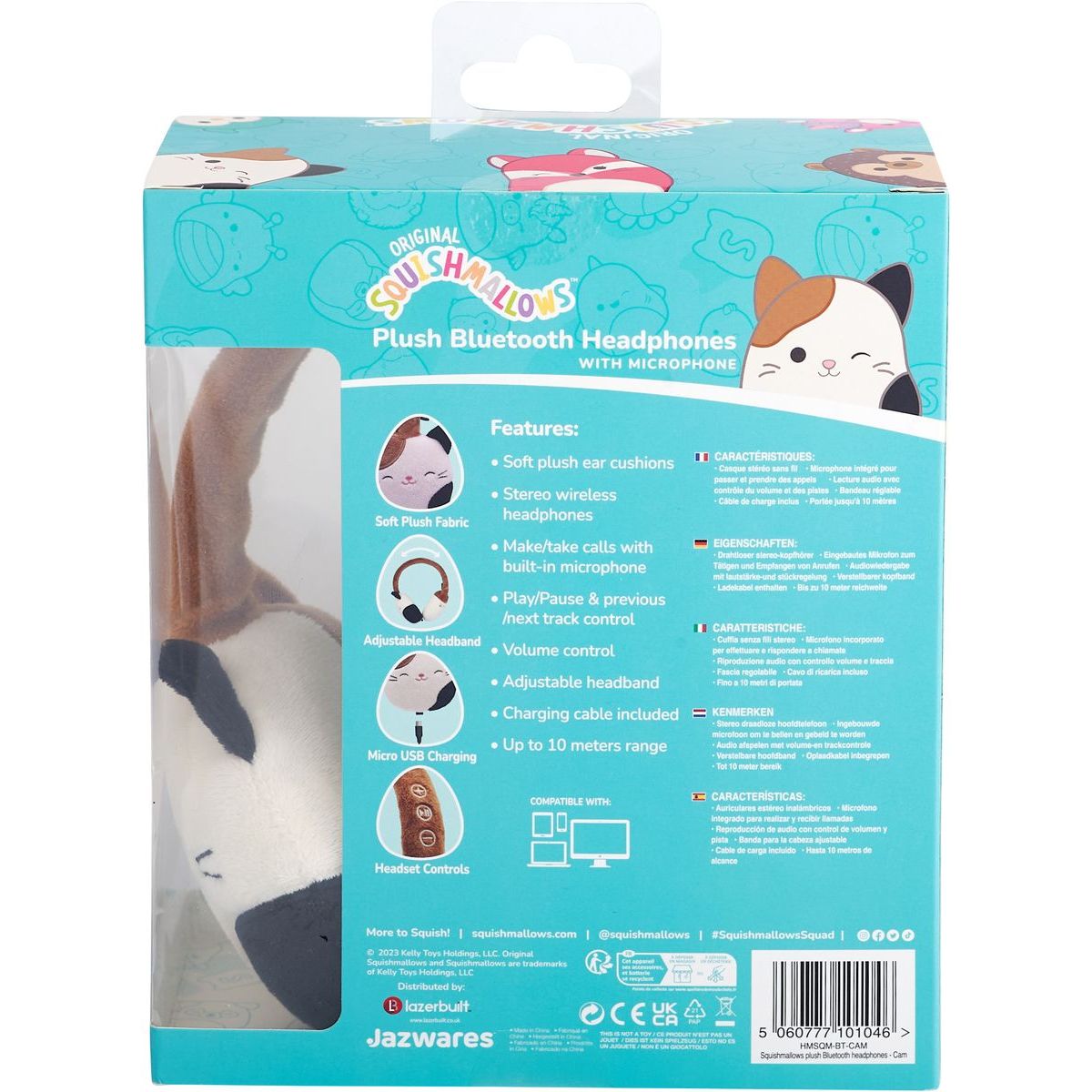 Squishmallows Plush Bluetooth Headphones - Cam sú mäkké plyšové slúchadlá ideálne pre deti od 6 rokov, ktoré chcú počúvať svoju obľúbenú hudbu alebo rozprávky pohodlne a bez káblov. Vyrobené z jemného materiálu, poskytujú dlhodobý komfort pri nosení a vďaka technológii Bluetooth v5.0 sa ľahko pripoja k akémukoľvek zariadeniu. Každý kus má svoj vlastný príbeh, čo robí počúvanie ešte zábavnejším.