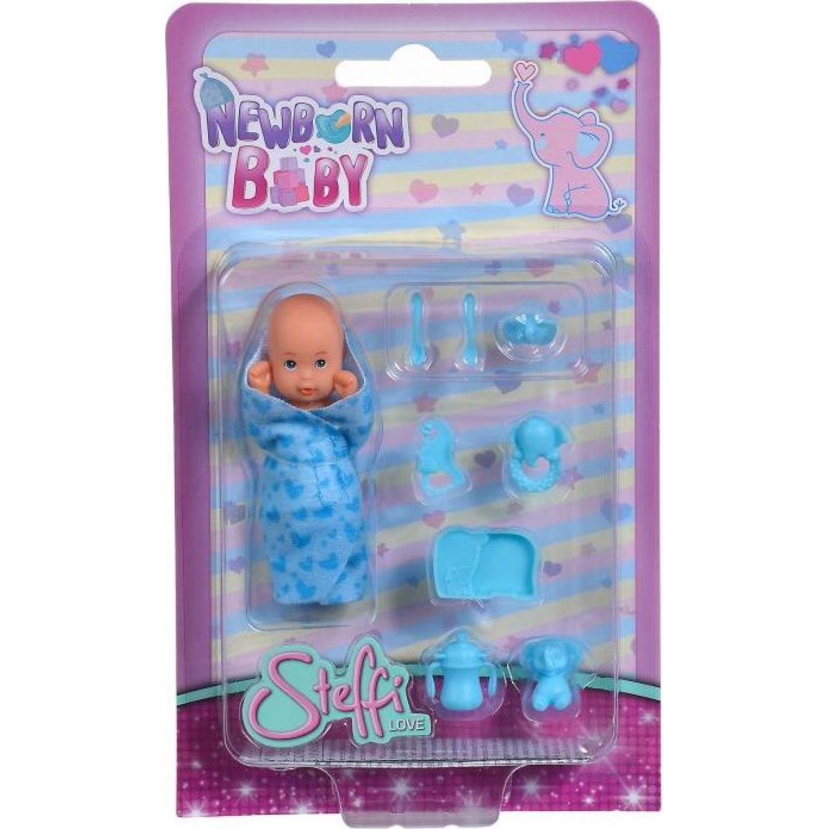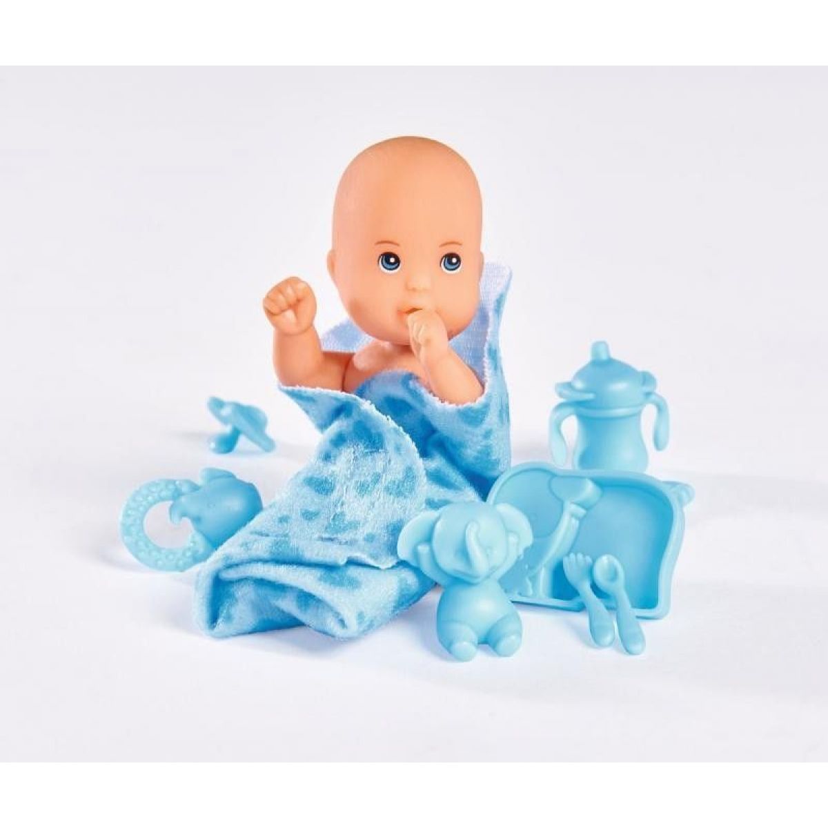 Malé bábätko je zavinuté do svetlo modrej dečky. Dievčatká sa môžu o bábätko naučiť pekne starať, majú k dispozícii potrebné príslušenstvo.