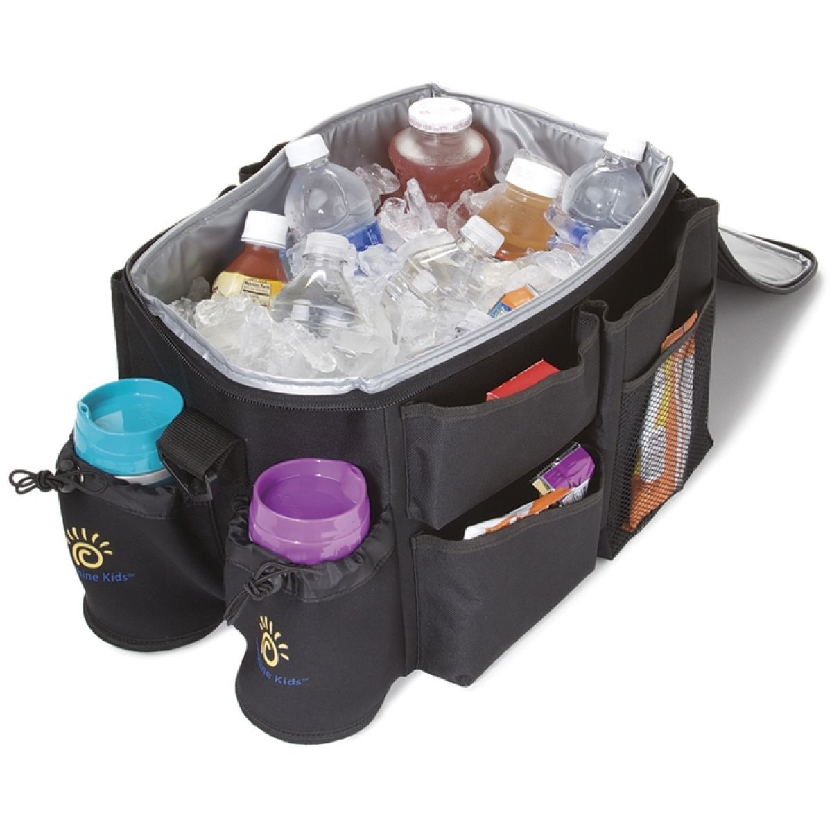 Praktický box vhodný na ukládání hraček a jiných potřeb při cestování. S velkým úložným prostorem (který je možno rozdělit na 4 části), 8 vnějšími kapsami na drobnosti a 2 termo-kapsami na láhve. Nepropustný, izolační, spolu s ledem lze využít i jako chladící box. Se zipem a nastavitelným popruhem přes rameno pro snazší přenášení. Rozměr: délka 35,5cm x šířka 26,7cm x výška 23,5cm. Barva: černá.