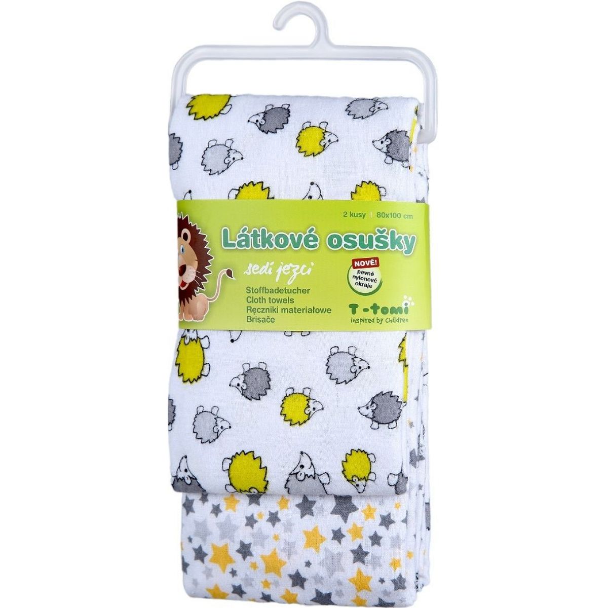 Sada dvou kvalitních osušek je laděna do bílé, šedé a žluté barvy. Vysokogramážní bavlna ve spojení s jemným flanelem vytváří měkký a savý povrch, který je příznivý k dětské pokožce. Proto je osuška příhodná pro osušení miminka po koupání, ale také jako podložka či přikrývka do kočárku. Potisk plen sjednocuje moderní design.