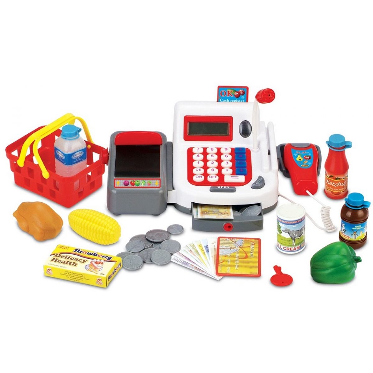 Bílo šedá pokladna s LCD displejem a reálnými funkcemi čeká na všechny malé prodavače.