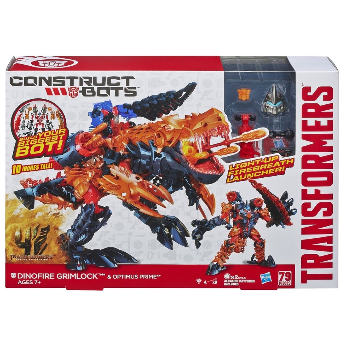 Sestavte si toho největšího dinobota se sadou Construct Bots Dinofire Grimlock! Ze 79 dílkůmůžete postavit velkého, 25 cm dlouhého Grimlocka v režimu robota nebo dinosaura. Dokáže hýbat hlavou a otevírat čelisti, ve kterých drží svítící se raketomet. Mezi doplňky má taky 2 rychlá děla, které střílí projektily!