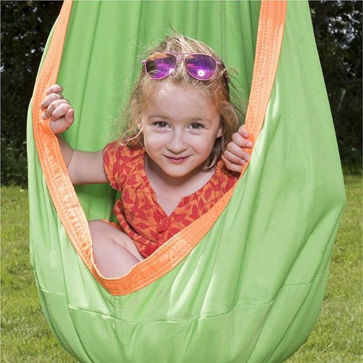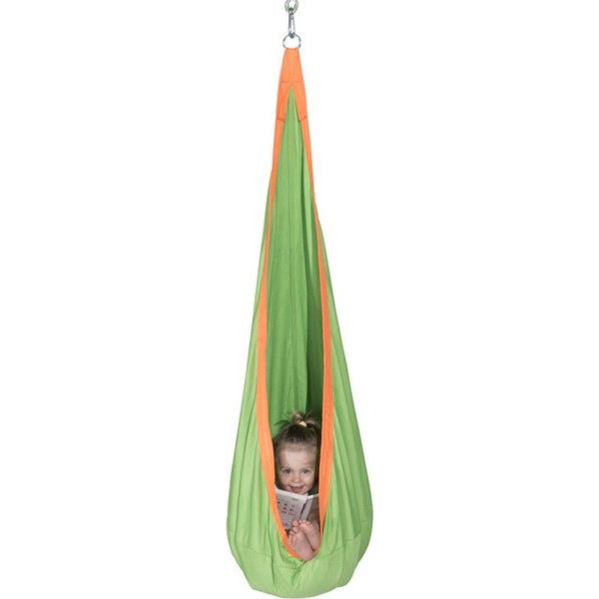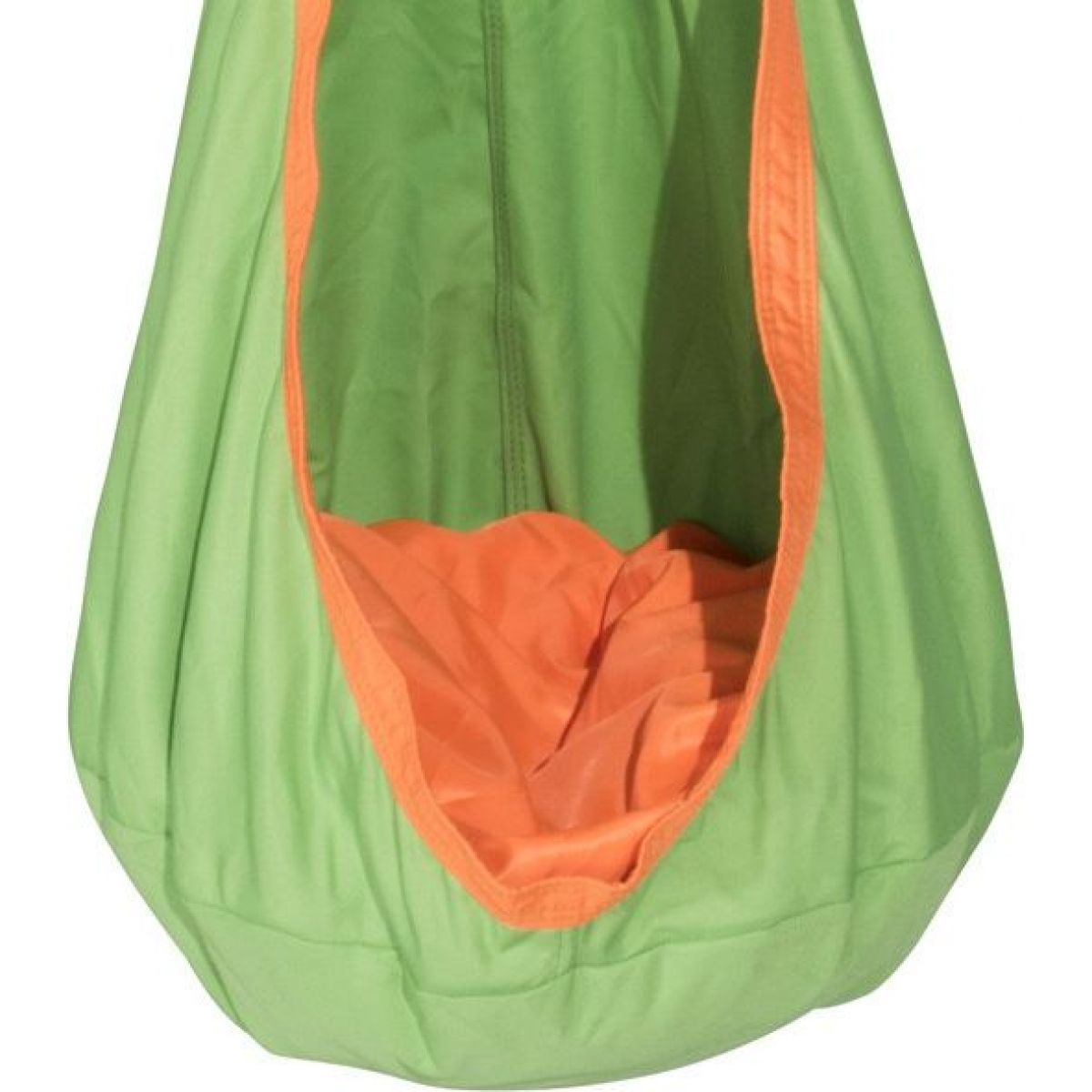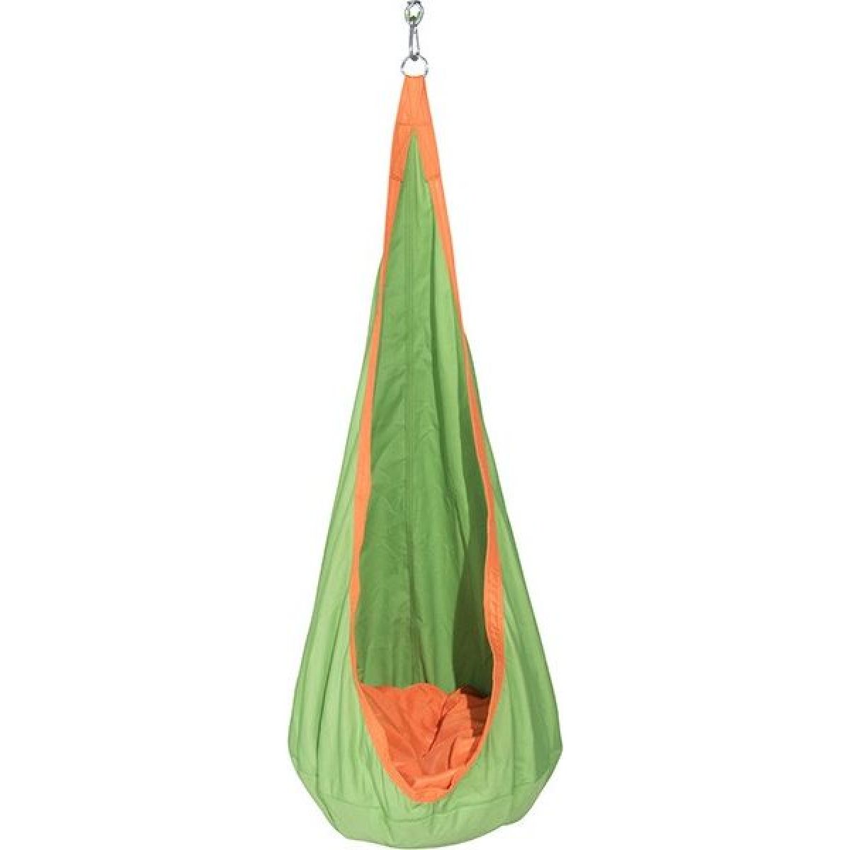 Cocoon zelené barvy zavěšený optimálně do výšky od 175 do 190 cm, dokáže nabídnout poklidné místo za příjemného pohupujícího se pohybu. Pro zavěšení je v horní části oko a karabina.