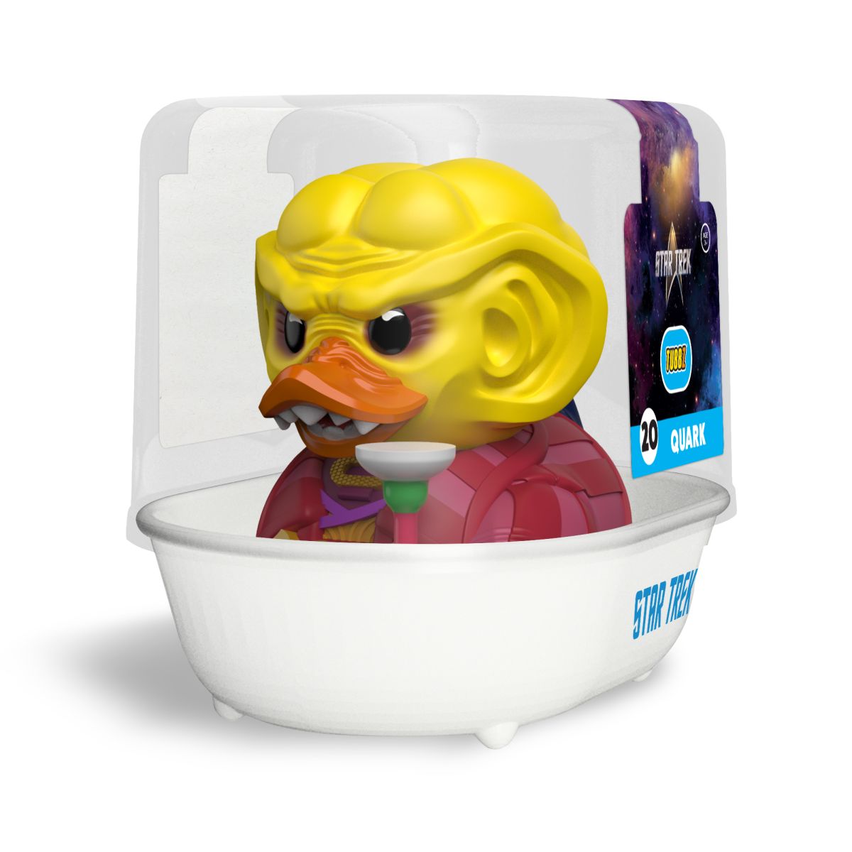 Táto milá Tubbz kačička Star Trek - Quark poteší malých aj veľkých fanúšikov vesmírnych príbehov. Je to oficiálny licencovaný produkt vyrobený z kvalitného PVC materiálu s veľkosťou približne 9 cm. Kačička je zabalená v peknom zberateľskom boxe s číslom limitovanej edície, čo ju robí výnimočnou a jedinečnou! Upozornenie – nie je určená do vody, aby zostala stále krásna. Vhodné pre deti od troch rokov.