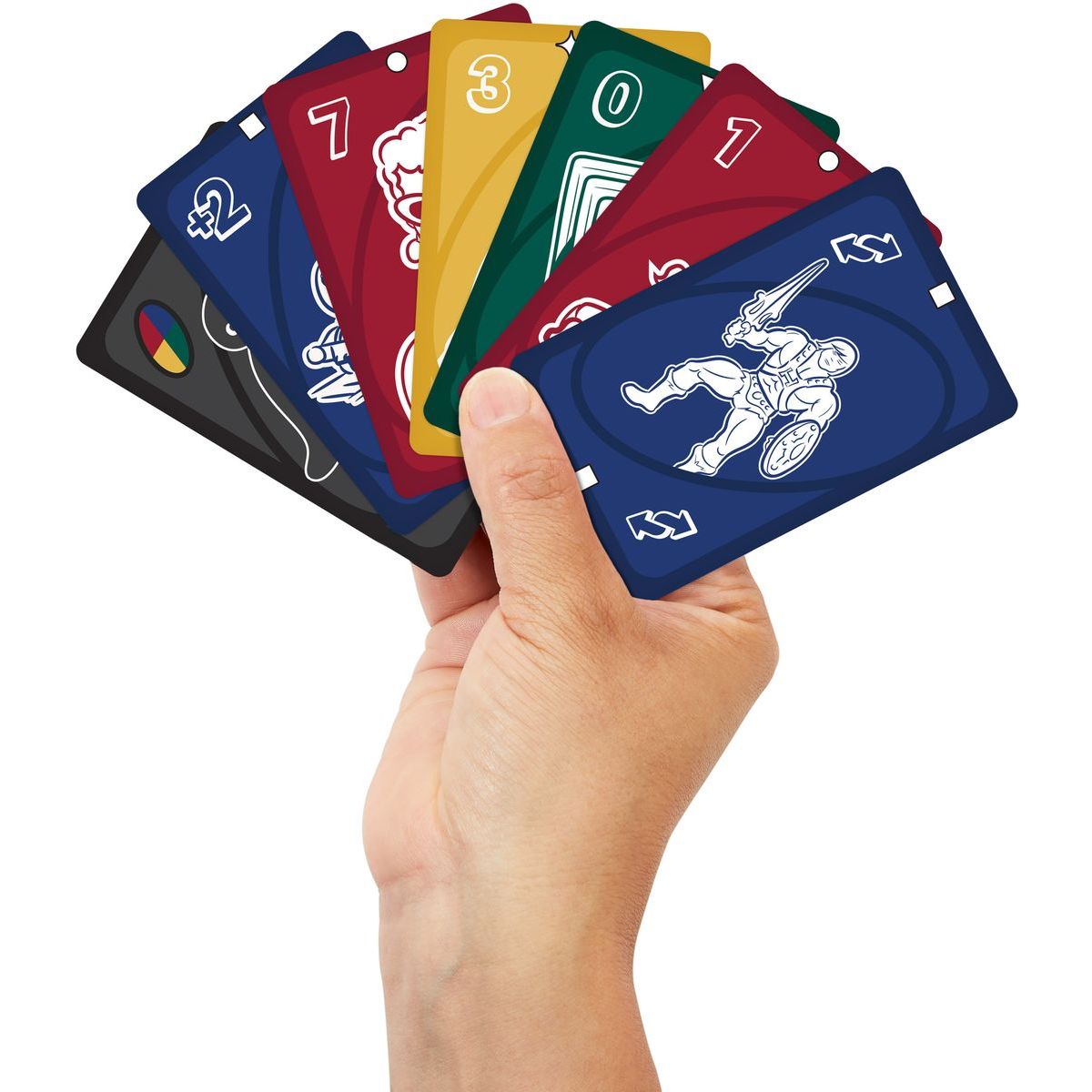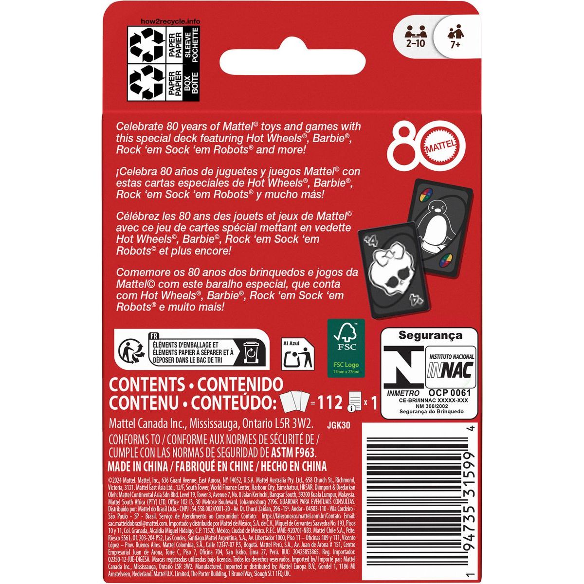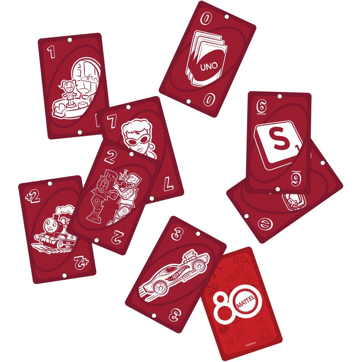 UNO k 80. výročiu Mattel prináša radosť všetkým hráčom od 7 rokov. Táto obľúbená kartová hra s farebnými číslami má grafiku inšpirovanú slávnymi hračkami Mattel, ktoré poznajú mnohí fanúšikovia po celom svete. Spojte farby a čísla a pokúste sa ako prví využiť všetky svoje karty! Keď vám zostane posledná karta, nezabudnite zakričať "UNO!" – práve tento okamih robí hru výnimočnou.