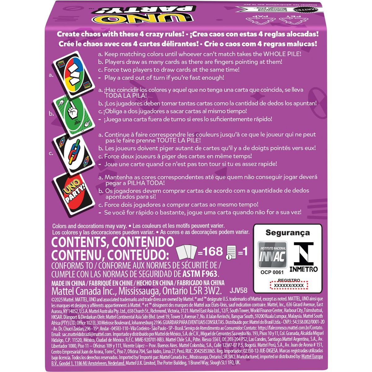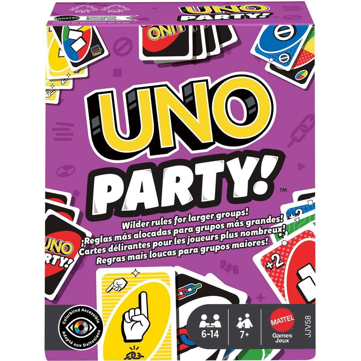 UNO Party je špeciálna edícia obľúbenej kartovej hry UNO určená pre väčšie skupiny hráčov. Obsahuje až 168 kariet, čo prináša viac zábavy a napätia pri každej hre. Pravidlá sú rovnaké ako pri klasickom UNO®, kde hľadáte kartu rovnakej farby, čísla alebo symbolu, no pridávajú sa aj nové interaktívne prvky ako karta „Ukáž na druhého“. Nezabudnite zakričať "UNO!" keď máte poslednú kartu! Táto verzia je skvelou voľbou na rodinné stretnutia či párty plné smiechu.