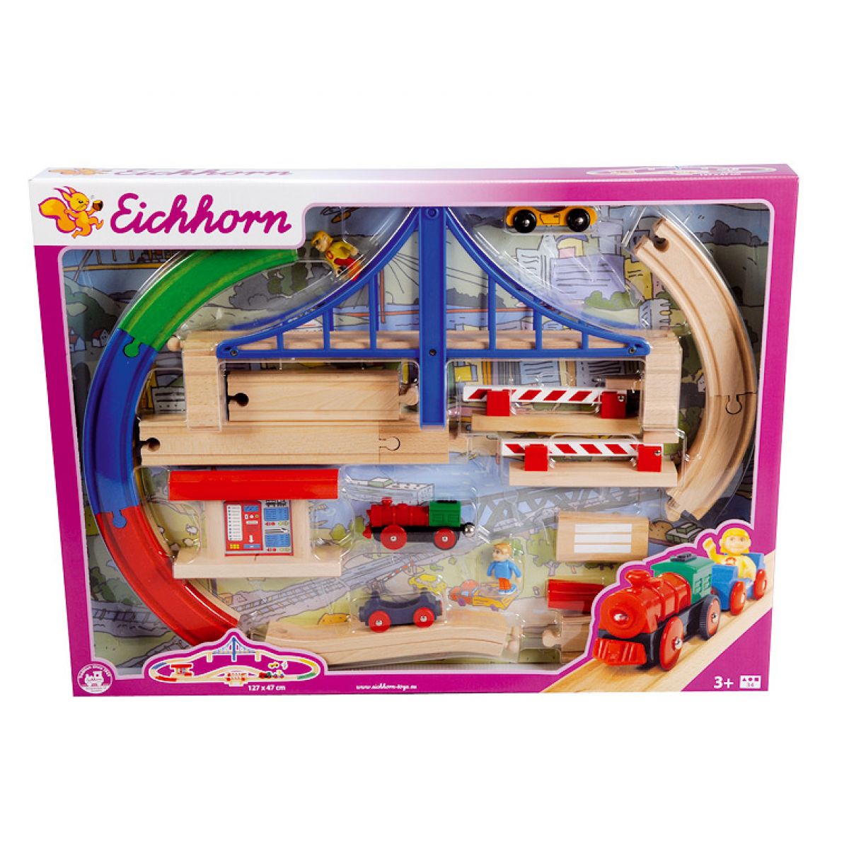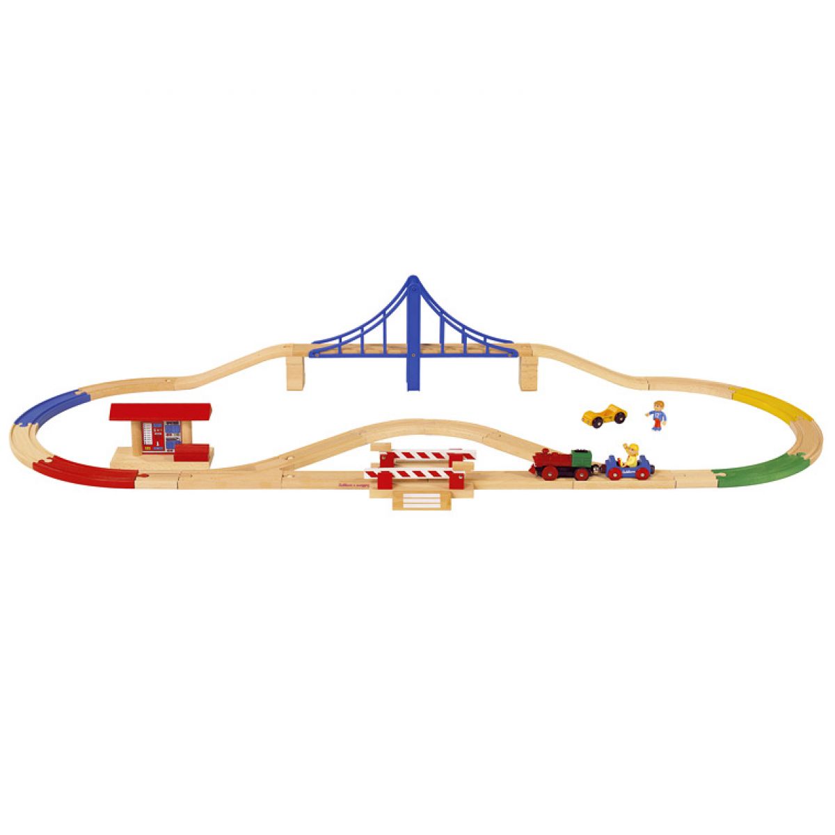Balení obsahuje: visutý most, elektrickou lokomotivu (včetně baterií), dráhu, autíčko, přejezd, zastávku a figurku.