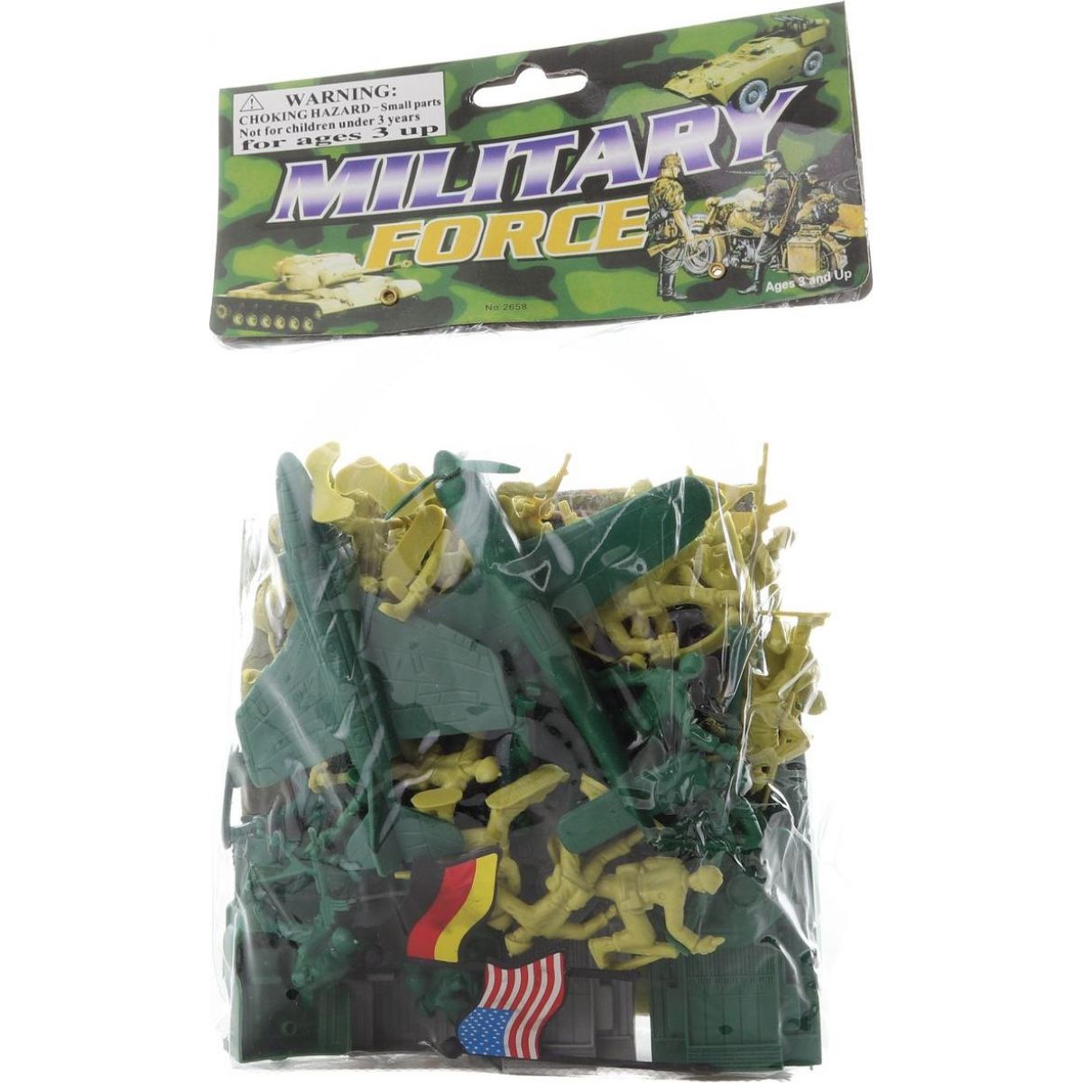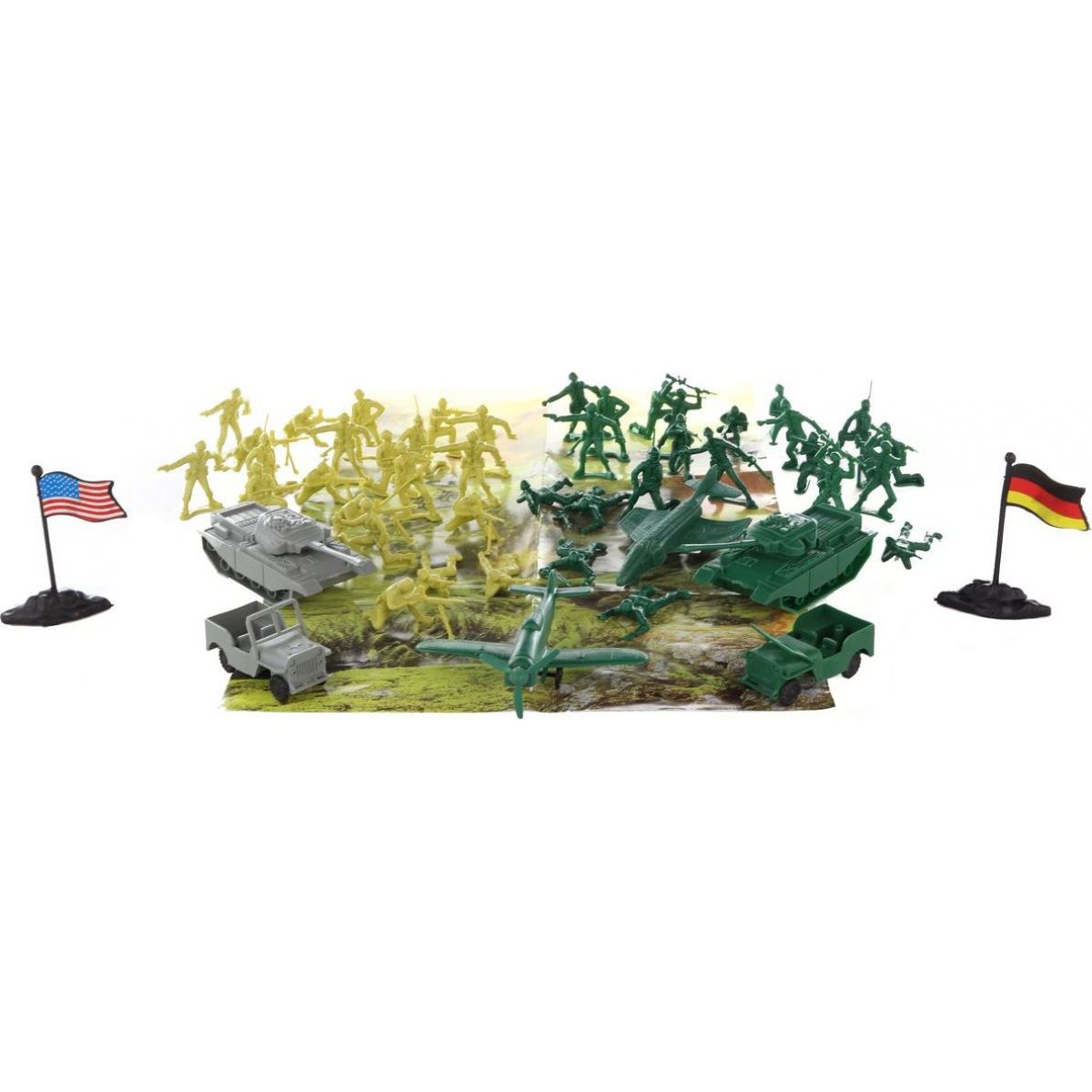 Sada plastových hraček se zaměřením na vojenskou tématiku. S takovou skladbou vojenských figurek a objektů, mohou chlapci sehrávat snadno akční bojové situace.