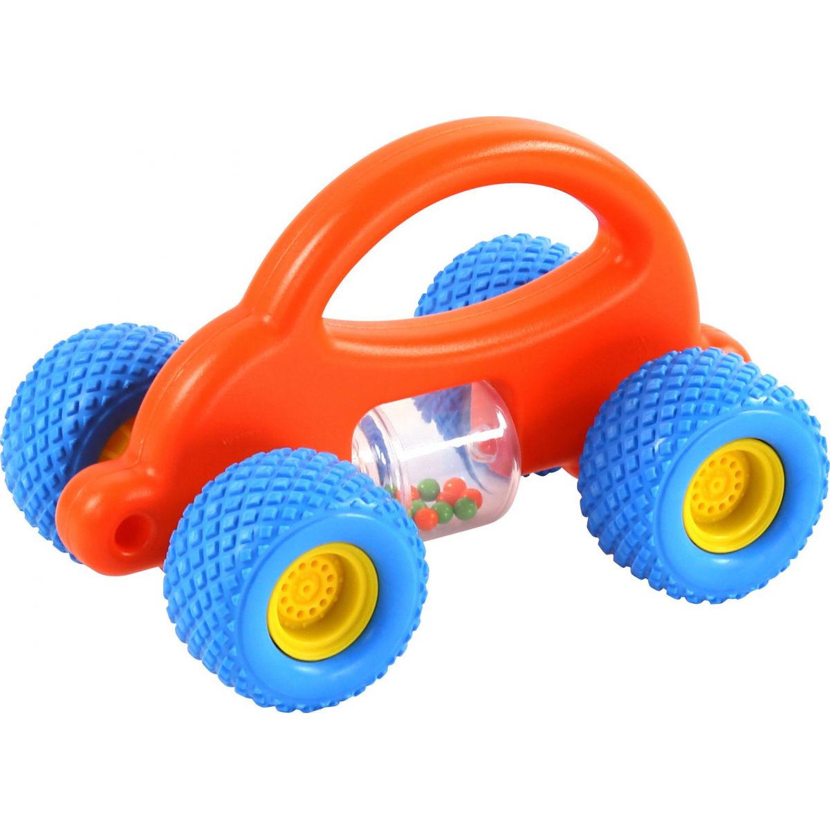 Autíčko na kolečkách s výbornou rukojetí na držení pro malu ručku. Se snadným úchopem dobře vytvarovaného ouška a měkkými gumovými kolečky se dětem dobře jezdí. Při jízdě navíc chrastí kuličky v průhledném válečku ve spodní části.