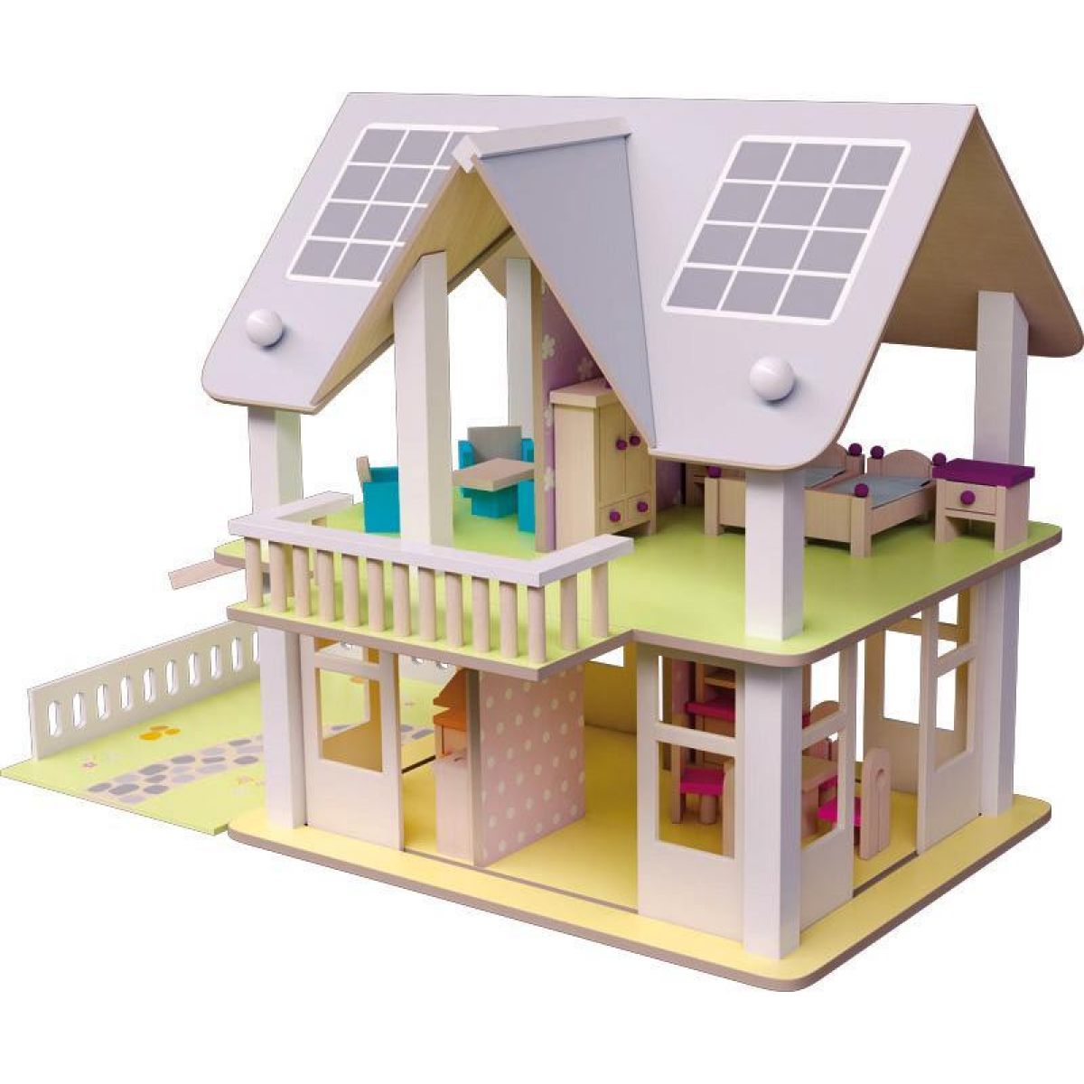 Domeček o rozměrech 50 x 40 x 54,5 cm je vyroben z kvalitního dřeva a dřevovláknitých desek. Je plně vybaven nábytkem - celkem 22 kusů a je určen pro malé panenky.