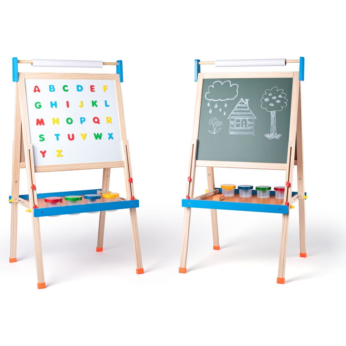 Obojstranná tabuľa na drevenej rozkladací konštrukcii, ponúka deťom plochu pre kreatívne činnosť. Na magnetickej ploche sa môžu zoznamovať s písmenami a zostavovať ich do jednoduchých slov. Na druhej strane si môžu z hornej časti tabuľ natiahnuť papier a maľovať s farbami v priložených téglikoch. Pokiaľ na tabuľu nebude papier môžu písať kriedami na zelenú plochu.