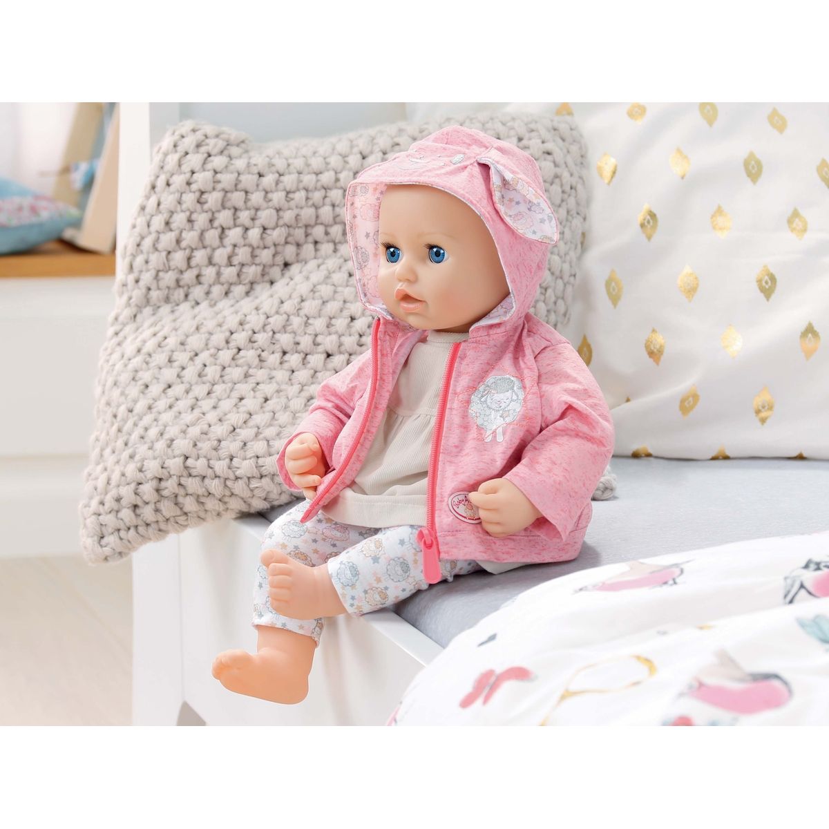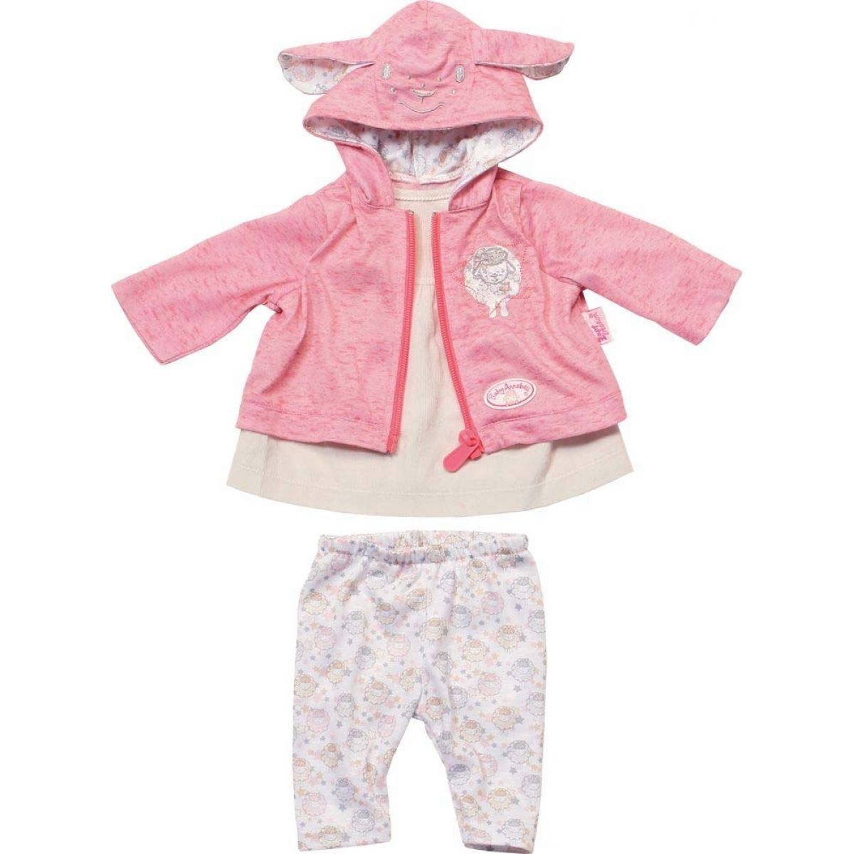 Příjemně pohodlná souprava pro panenky Baby Annabell. Souprava obsahuje barevné legíny s potiskem oveček a mikinou s potiskem ovečky s kapucou nebo bez kapuci.